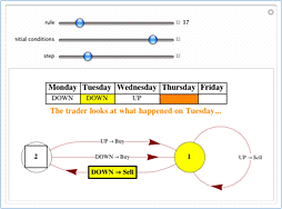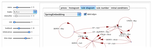 売り,買い,ホールドの3つの選択肢を持つトレーダーモデルの規則ダイアグラムを示すインタラクティブなツール