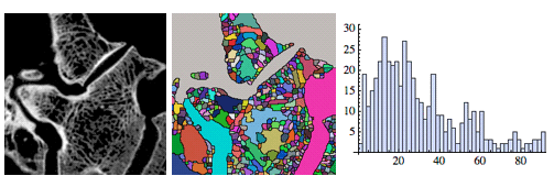 骨梁の画像,その色付けされた流域変換,および各流域面積のヒストグラム