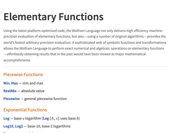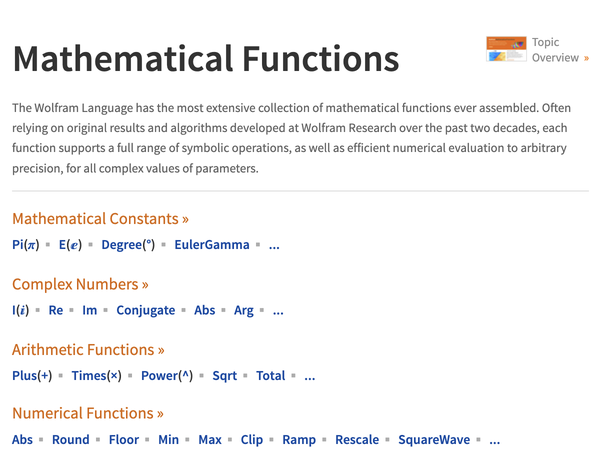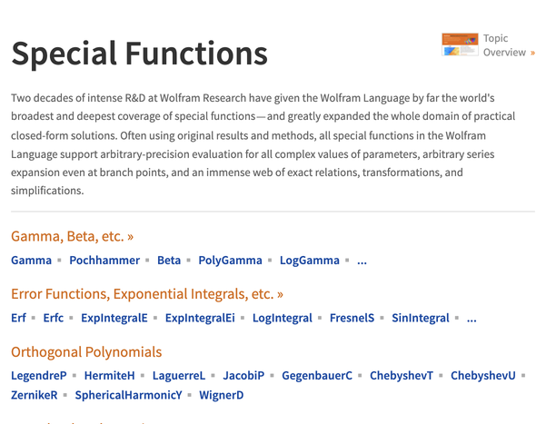 수많은 수학 함수의 기호적 및 수치적 평가, 시각화, 점근적 확장을 광범위하게 문서화하고 Wolfram 언어의 모든 영역과 긴밀하게 통합되어 있습니다.