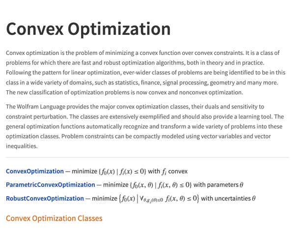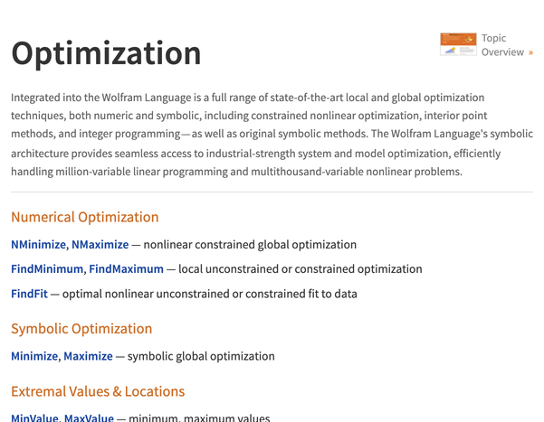 Wolfram Otimização é uma parte embutida da Wolfram Language. Todo o sistema contém mais de 6 mil funções integradas, abrangendo todas as áreas da computação — tudo cuidadosamente integrado para que funcione perfeitamente em conjunto.