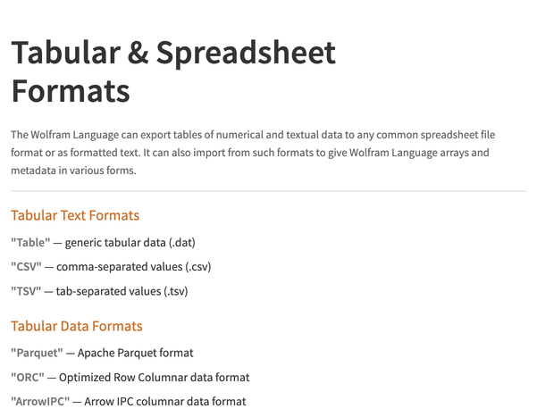 Import columnar storage formats such as Parquet and ORC. Automatically detect headings and understand the structure of CSV and other formats. Get data directly as built-in computable entities from the Wolfram Knowledgebase.