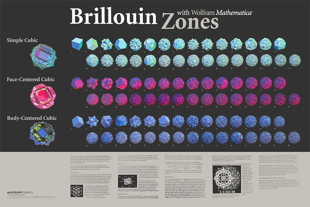 This 24" by 36" poster features Mathematica-created illustrations of Brillouin zones for simple cubic (SC), body-centered cubic (BCC) and face-centered cubic (FCC) lattices. This poster also includes a brief discussion about Brillouin zones and basic crystal structures, such as Bravais lattices, reciprocal lattices and primitive cells. Created by Wolfram Research (2008).