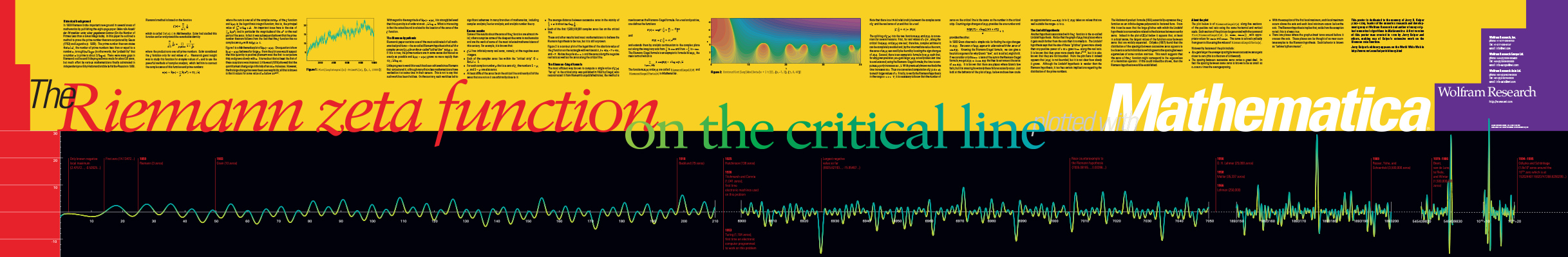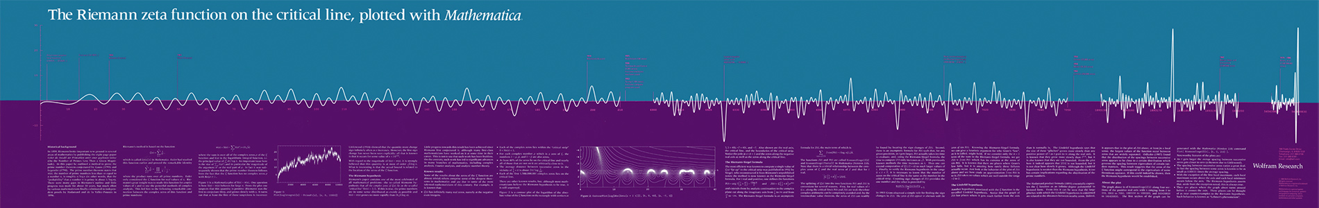 This 60" by 14" poster plots zeros of the Riemann zeta function on the critical line together with annotations for relevant historical information. Created by Wolfram Research in 1990 (teal/purple) and updated in 1995 (yellow/black).