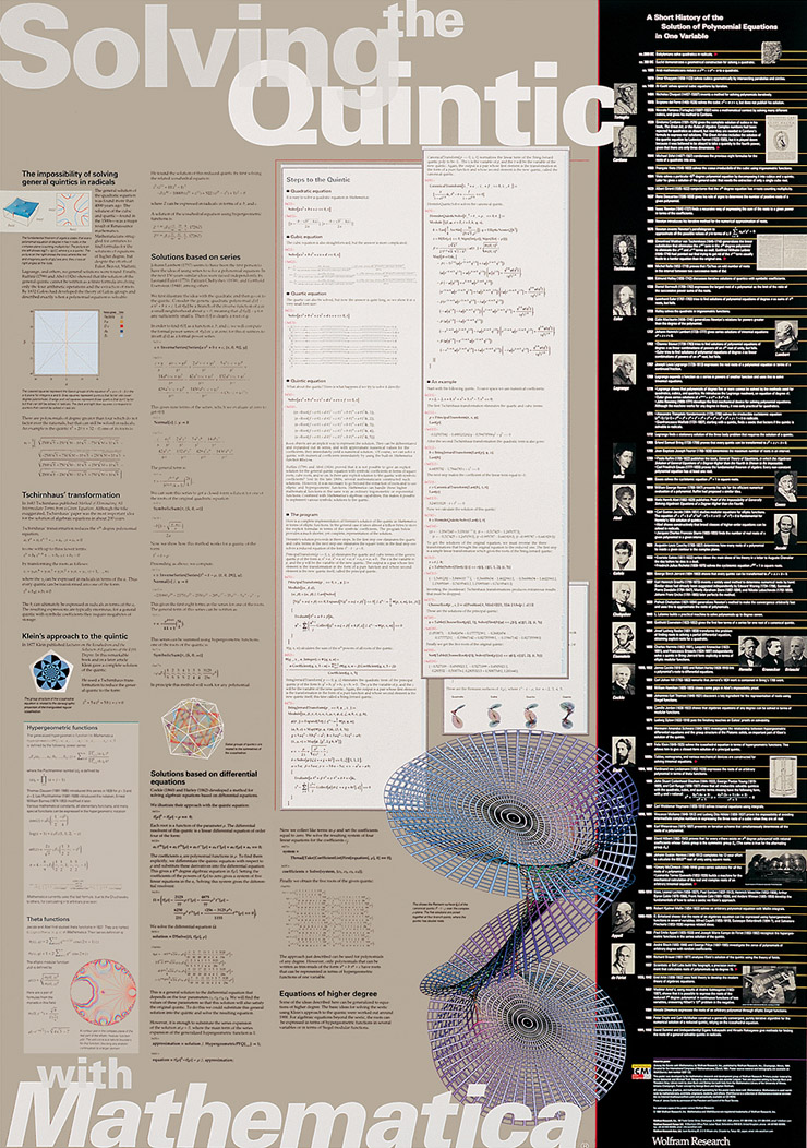 This 27" by 38" poster features the history behind several solutions to the quintic, including a description of how formulas for the quintic were derived and implemented in Mathematica. Created for the International Congress of Mathematicians, Zürich, 1994. Learn about the mathematics and history behind the poster. Created by Wolfram Research (1994).