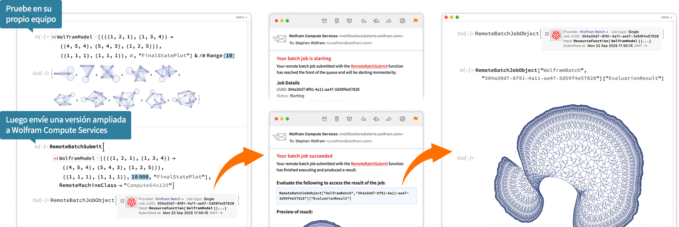 Si utiliza Mathematica, Wolfram|One o Wolfram Engine 14.3 en su equipo de escritorio, ejecute RemoteBatchSubmissionEnvironment["WolframBatch"] una vez para habilitarlo. Actualmente la funcionalidad está disponible de manera automática en Wolfram Cloud, y lo estará en futuras versiones de los clientes de escritorio de Wolfram.