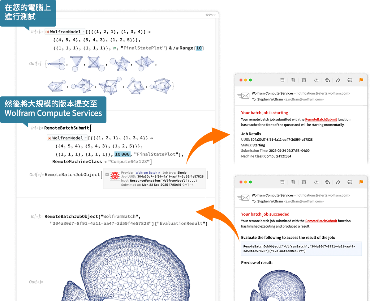 Wolfram Compute Services 負責所有配置與編排,讓您能即時且穩健地以超級電腦規模執行任何 Wolfram 運算,並可存取大規模平行運算、大容量記憶體、大型 GPU 等資源。