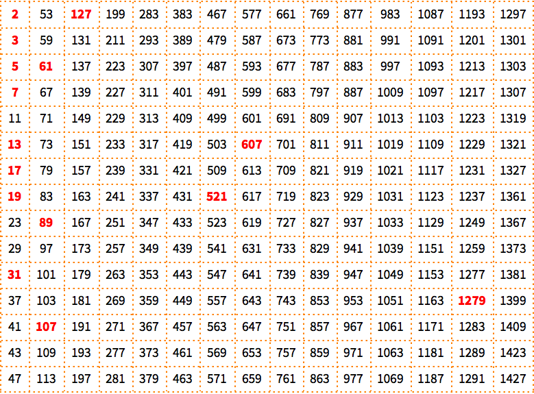 Visualize como é dispersa a distribuição de pequenos expoentes primos de Mersenne, destacando-os em vermelho na lista dos primeiros 225 números primos.