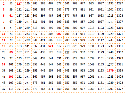 在前 225 个素数列表中用红色显示较小的梅森素数指数,以显示其分布的稀疏程度.