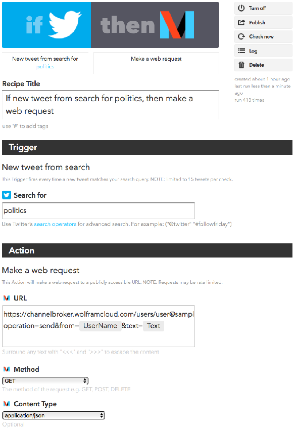 Создадим IFTTT, который отправляет данные каналу, как только кто-то упоминает слово "политика" в сети Twitter.
