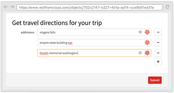 "Title" -> "Get travel directions for your trip"|>]]このフォームは2つのフィールドから始まるが,プラス符号を押すとフィールドを増やすことができる.