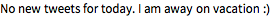 "Message" -> "No new tweets for today. I am away on vacation :)"]创建一个 ScheduledTask,在一个星期内每天发送这条推文并在完成后删除自身.