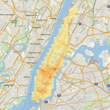 GeoHistogram[Normal[manhattanCollions[All, "Coordinates"]],