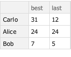 "Carlo" -> <|"best" -> 31, "last" -> 12|>|>, "scoreboard"]Out[1]=