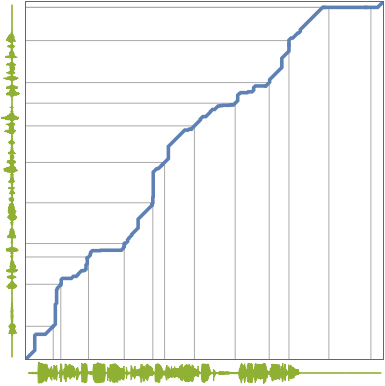 DistanceFunction -> WarpingDistance] // MatrixPlotWarpingCorrespondenceを使って,2つの録音音声間の動的時間伸縮対応を計算する.