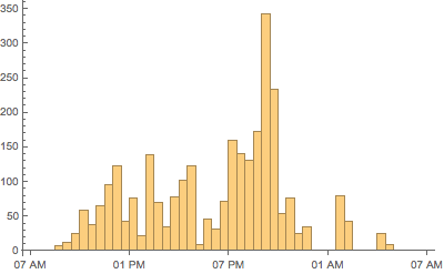 exif = Select[exif, MatchQ[#, _Association] &];Visualize a distribuição da hora do dia em que as fotos foram tiradas.