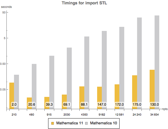 Der Zeitbedarf beim Importieren des STL-Dateiformats im Vergleich. Die Experimente wurden auf einem Intel Core 2 Duo 3.06 GHz Mac OS X Lion-System durchgeführt, mit einem Zeitlimit von 1000 Sekunden. Die Zahl am unteren Rand gibt an, wie viel mal schneller Mathematica 11 im Vergleich zu Mathematica 10 ist.
