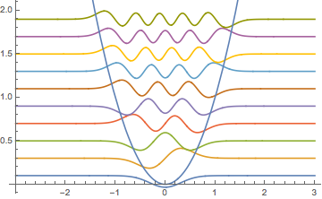 \[ScriptCapitalL] = -h^2*u''[x] + V[x]*u[x];調整されたメッシュ上で,固有値と固有関数を小さい方から10個求める.