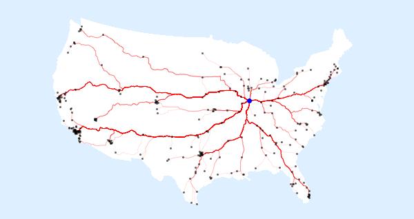 アメリカの300の都市から,イリノイ州シャンペーンにあるWolfram Researchの本社までの経路を描画する.