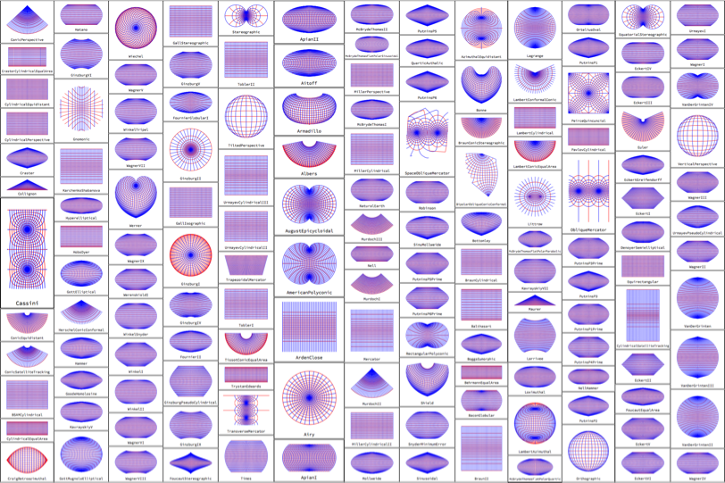 球体基準モデルの151の投影法すべてについて経緯度の格子を計算する.