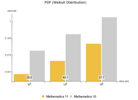 バージョン11では,広範に渡る分布特性の数値計算が拡張されている.以下のグラフは,さまざまなサンプルサイズについて計算速度を比べたものである.実験は,Intel Xeon Processor E3-1245 v2 3.40 GHzを搭載したWindows 10のシステムを使って行われた.一番下の数字は,バージョン11がバージョン10と比べてどのくらい速いかを示す.