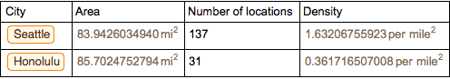 "Query" -> "Vegan and vegetarian food", MaxItems -> 300];获取位置的数目和密度.