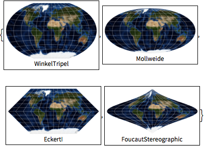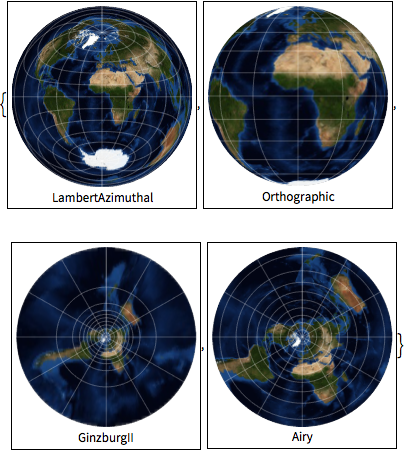 worldmap /@ {"LambertAzimuthal", "Orthographic", "GinzburgII", "Airy"}Out[6]=