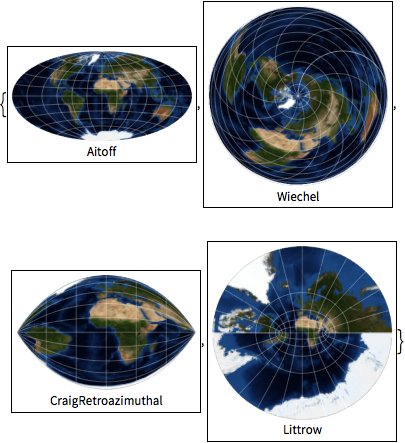 worldmap /@ {"Aitoff", "Wiechel", "CraigRetroazimuthal", "Littrow"}Out[7]=
