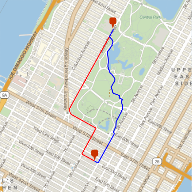 센트럴 파크를 가로지르는 것이 거리는 짧지만, 시간은 더 오래 걸립니다.