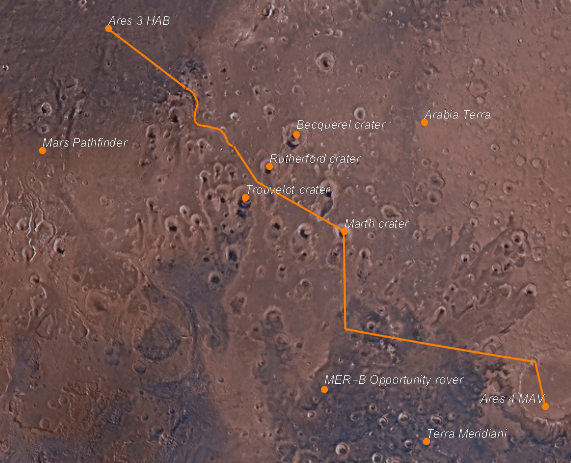 書籍「火星の人」で,主人公のマーク・ワトニーがアレス3のハブからアレス4の火星上昇機まで行くのに通った推定経路を計算し,表現し,測定する.
