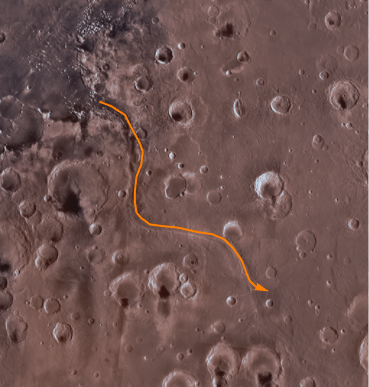 GeoGraphics[{Thick, Orange, Arrow@GeoPath[mawrthVallis]},