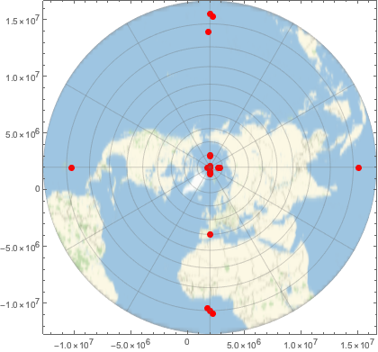 Represente estos puntos usando una proyección "UPSNorth". Note que el Polo Norte no está en {0, 0} en las coordenadas proyectadas debido a los parámetros de la retícula de origen no trivial.