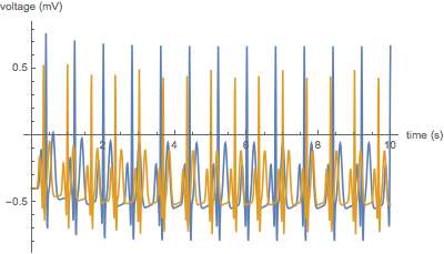 AxesLabel -> {"time (s)", "voltage (mV)"}, DataRange -> {0, 10},