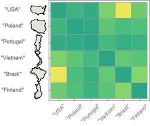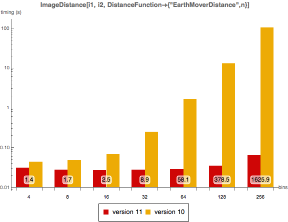 O desempenho de ImageDistance foi otimizado com a função de distância "EarthMoverDistance" distance function. Aqui estão os tempos para ImageDistance na versão 11 e na versão 10 como a função de número de compartimentos de "EarthMoverDistance".A experiência foi feita em um sistema Windows 10 de 64 bits equipado com um processador Intel Core i5-3570K @ 3.40 GHz CPU. O número na parte inferior mostra o quanto a versão 11 é mais rápida que a versão 10.