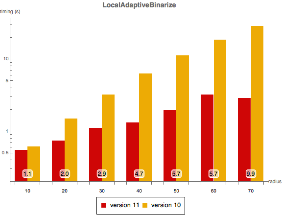 Os tempos de cálculo para LocalAdaptiveBinarize na versão 11 e na versão 10 em termos do tamanho de raio. A experiência foi feita em um sistema Windows 10 de 64 bits equipado com um processador Intel Core i5-3570K @ 3.40 GHz CPU. O número na parte inferior mostra o quanto a versão 11 é mais rápida que a versão 10.