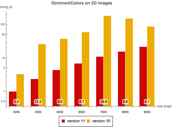 Os tempos DominantColors na versão 11 e na versão 10 como a função de comprimento lateral. A experiência foi feita em um sistema Windows 10 de 64 bits equipado com um processador Intel Core i5-3570K @ 3.40 GHz CPU. O número na parte inferior mostra o quanto a versão 11 é mais rápida que a versão 10.
