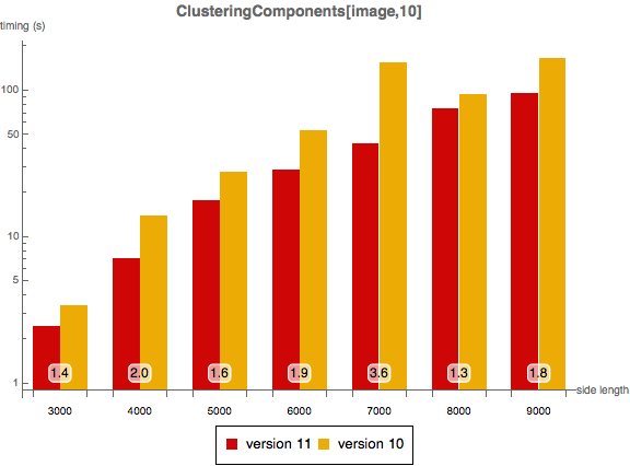 Os tempos para ClusteringComponents na versão 11 e na versão 10 como uma função de comprimento lateral. A experiência foi feita em um sistema Windows 10 de 64 bits equipado com um processador Intel Core i5-3570K @ 3.40 GHz CPU. O número na parte inferior mostra o quanto a versão 11 é mais rápida que a versão 10.