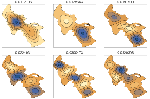 y], {x, y} \[Element] \[CapitalOmega], 64];Отобразим первые шесть режимов колебаний волн.