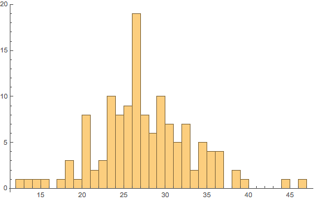 このヒストグラムは,最もよくある長さは,英語のように26文字であるが,26文字のアルファベットすべてに同じ文字が含まれているわけではないことを示している.