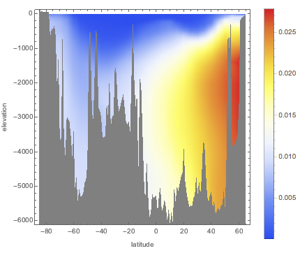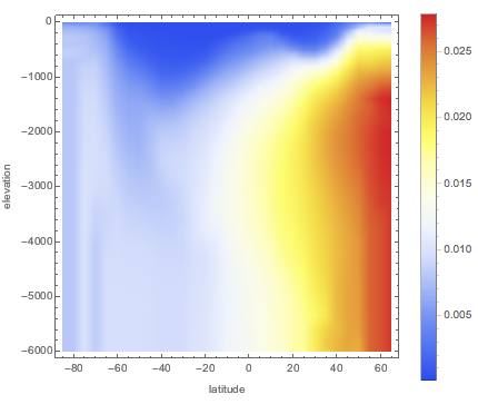 {lat, -85, 65, 5}, {d, 0, 6000, 50}];最高偏差出现在较大纬度上.