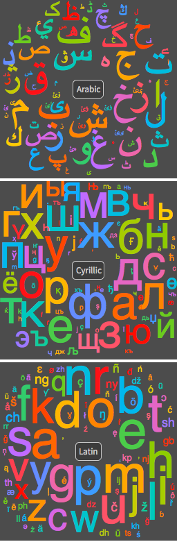 Entity["WritingScript", "Latin::6tr5q"]};对于每个脚本,在 Alphabet 和隐性分类的帮助下,根据脚本对每个字母构建带计数的关联.