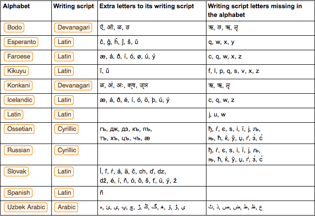 Você pode construir uma tabela com a diferença entre o conjunto de letras de alguns alfabetos e seus sistemas de escrita.