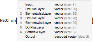 net = NetChain[{30, Tanh, 20, Tanh, 3, SoftmaxLayer[]},