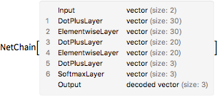 net = NetChain[{30, Tanh, 20, Tanh, 3, SoftmaxLayer[]},