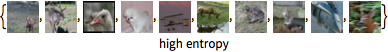 从一个随机抽样中,选出网络给出最高熵和最低熵预测的图像. 高熵输入可以认为是那些网络对其正确的类最不确定的目标.