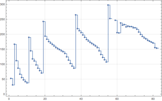 ListStepPlot[Table[ElementData[z, "AtomicRadius"], {z, 82}],