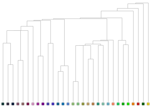 colors = RandomColor[30]Dendrogram[colors, ImageSize -> 500]