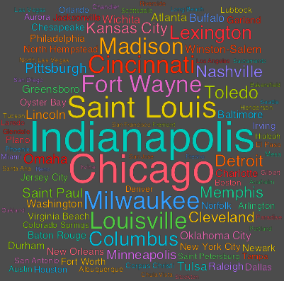 Создайте облако слов из названий городов, соединённых с расстояниями до них, и используйте шкалу обратных величин, чтобы выделить те города, которые расположены ближе.