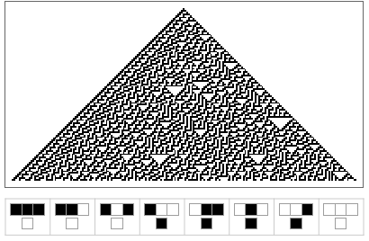 Plotten Sie ausgehend von einem einzelnen schwarzen Quadrat die Evolution der Regel 30 über 100 Zeitschritte. Erstellen Sie auch eine Legende, die das Zeichen der Regel zeigt.