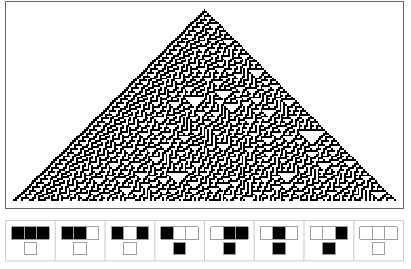 Начав с одного чёрного квадрата, графически изобразите развитие правила 30 простейшего клеточного автомата для 100 действий и укажите легенду, демонстрирующую знак правила.