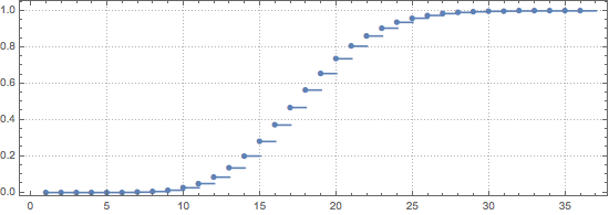 ListStepPlot[CDF[PoissonDistribution[17], Range[0, 35]], PlotMarkers -> Automatic, Joined -> False, PlotTheme -> {"Detailed", "Wide"}, ImageSize -> 550]